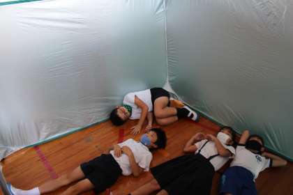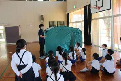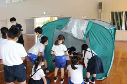 10月1日(金)社会の「自然災害から暮らしを守る」学習で、体育観で避難所の体験をしました。市の危機管理課から貸していただいた、間仕切り用ののテントが、手早く組み立てられること、実際に広さなどが分かりました。実際に避難してみると、どんな様子なのか、想像を巡らしていました。