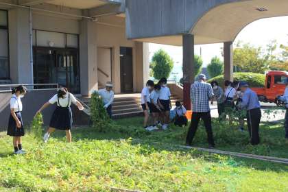 10月4日(月)ランチルームを覆って、日光を和らげてくれたゴーヤを公民館の方々に撤去していただきました。6年生も網から、つるをはがしたり、草を集めたりして手伝いました。日中は暑い日が続いているので、カーテンの日陰もありがたいのですが、ゴーヤがなくなりすっきりしました。