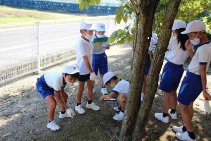 10月4日(月)学級活動で校内ネイチャーゲームを楽しみました。木の葉や草花、木々など校内にある自然物で、丸や三角、ハートなどの形や、WやXなどのアルファベットに似た形をグループで探しました。見つけた証拠にタブレットで画像を撮影していきました。