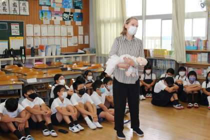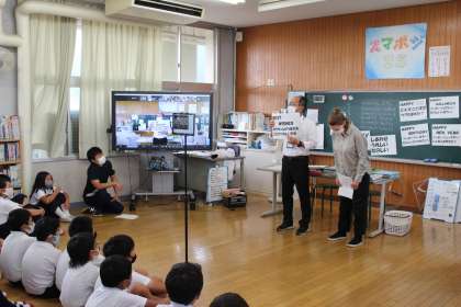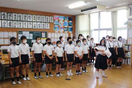 10月12日(火)5年生の教室からオンラインで全校朝会をしました。表彰の後、ALTのマリー先生と学校長で「英語となかよし」をしました。ハロウィンの話の後、出産予定のマリー先生に英語でおめでとうを各教室から伝えました。最後に、職員室と5年生教室から、日本語と英語の子守歌を、教職員や5年生、マリー先生が歌いました。