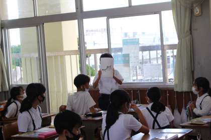 10月12日(火)3年生は外国語活動で、ハロウィンの仮装について調べました。こんなお化けに仮装してみたいと、調べたお化けを絵に描いて発表しました。ろくろ首や一反木綿、日本らしいお化けがたくさん紹介されました。