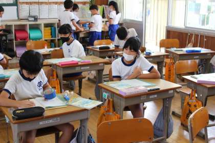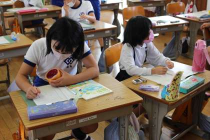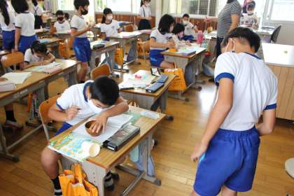 10月14日(木)算数で円を勉強しています。今日は、身の回りの物を使って○を書き写す勉強をしました。ガムテープや紙コップ、スティックのりなどを使って、ノートに書いてみました。さらに糸や厚紙を使って書いてみて、次の時間に、もっと便利な道具であるコンパスの使い方を習います。