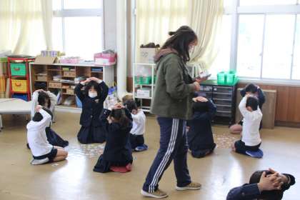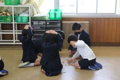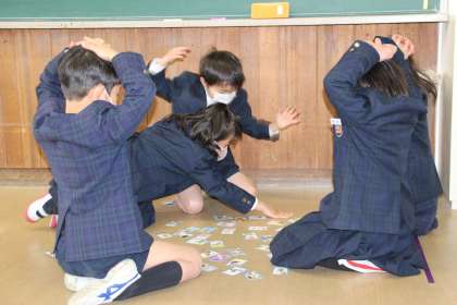 1月12日(水)1年生は生活科室でカルタとり大会をしました。グループに分かれて担任が読んだカルタの絵札を探しました。読んでいる間は、手は頭の上において、一生懸命探しました。取ることができてうれしかったり、取れずに悔しかったりしますが、友だちとの活動を楽しんでいました。