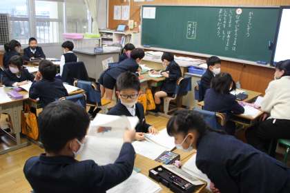 2年生の1時間目は国語でした。かさこじぞうの読み取りです。おじぞうさまは、じさまとばさまにどうして品物をもってきたのかグループで話し合っていました。