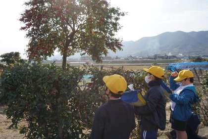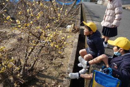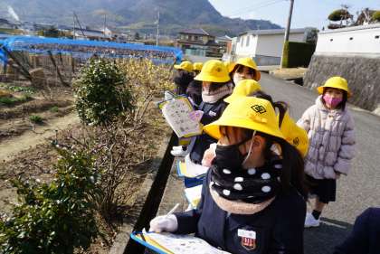 1月26日(水)1年生は生活科で町探検に出かけました。学校周辺を回りました。秋とは違う冬の生き物や植物を見つけに行きました。温かい日差しの中、梅やつばきのつぼみの膨らみ、ロウバイやボケの花など木々の様子に春の訪れも感じたようです。気持ちよく友だちと探検できました。