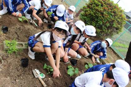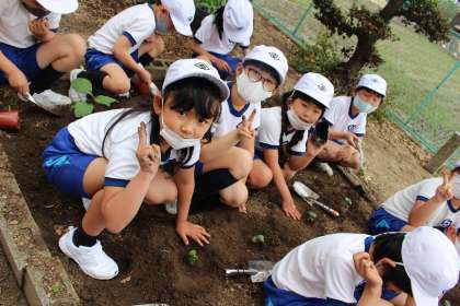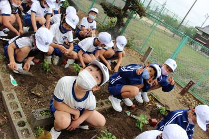 自分の育てたい(食べたい)夏野菜を選んで、観察し、5月7日(金)に苗植えをしました。今回は、学校に一人一台導入されたタブレットを使って、自分の野菜の写真も撮りました。野菜に向かって「かわいいね〜♥」「元気に育ってよ〜」等声をかけながら撮影しているのも素敵でした。自分たちで育てた野菜を食べるのが楽しみです♪それまで愛情持って育てます♥