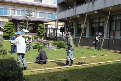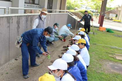 5月10日(月)6年生が苗植えをした後、地域の方々で網を張ってくれました。竹を組んで、立派な網が完成しました。頑丈に組んであるのでゴーヤがほこっても大丈夫です。比地二分館の協力員の皆様ありがとうございました。