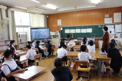 5月12日(水)田中先生に教えていただいて「人間コピー」のゲームをしました。廊下に貼られた海の中の様子を描いた絵を自分たちでコピーするというゲームです。廊下の絵を見られるのは、グループで一人だけです。描かれている魚やカニ、海藻などの大きさや向き、数や色といったたくさんの情報を読み取り協力して1枚の絵にしていきます。どこを見るかなどグループで考えながら進めていました。なかよく、楽しくのめあて通り、とても心地よい時間を過ごすことができました。