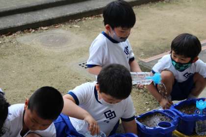 5月10日(月)アサガオの種まきをしました。説明を静かに聞いて、上手に種まきができました。土をそっとかけて、「はやく芽を出してね。」とやさしく声かけをしました。仕上げに水をかけました。芽が出て、花が咲くのが楽しみです。