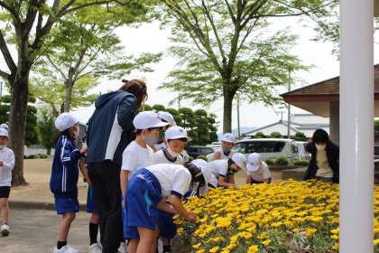5月12日(水)国語「みんなにはなそう」で自分が見つけたものを紹介するために学級園を散策しました。ダンゴムシやナメクジ、アリなどが見つかりました。ガーベラの葉の間にはカエルもいました!クイズを出し合い、大盛り上がりしました。これからもいろいろな生き物や植物を見つけていきたいです。