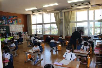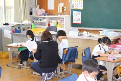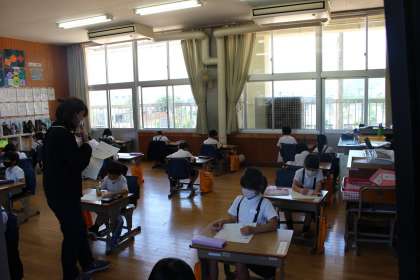 5月23日(日)3校時1年生は算数のテストです。「かずとすうじ なんばんめ」で勉強したことを確かめました。1問ずつ問題を説明していっしょに進めていきました。よく話を聞いて、一生懸命考えていました。
