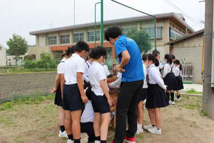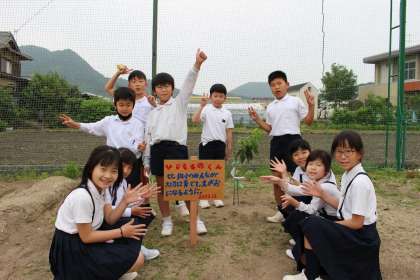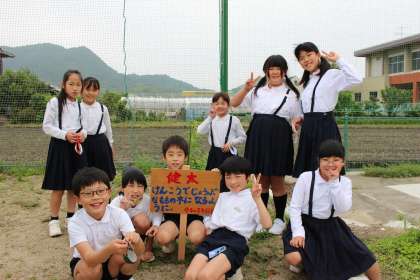 5月26日(水)昨年植えた2本の桃の苗木に名前をつけて、みんなで作った看板を設置しました。1本は比地小学校のみんなが大切に育てて、笑顔になるように願い「ひじももの」くん。もう1本は、健康で丈夫な桃になるように願い「健太」くん。みんなが目を輝かせて、看板を設置しました。しっかり世話をして桃の木を大きくしていきたいです。