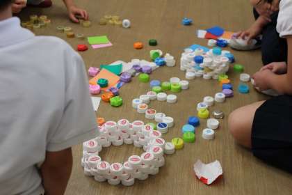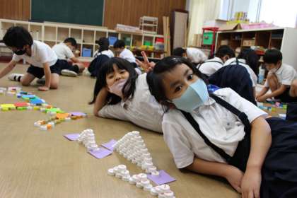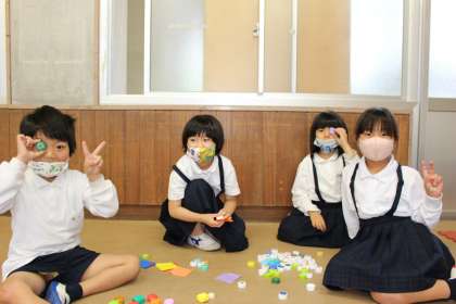 5月28日(金)図工で「いろいろならべて」の学習をしました。生活科室でペットボトルのキャップや折り紙を使って、どのグループも工夫して並べたり、積み上げたりすることができていました✨仲間と協力して考える力もついてきています。感心です!!