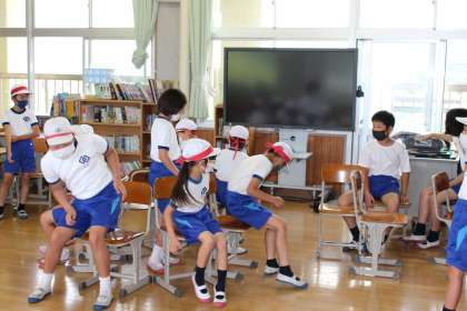 6月3日(木)朝のスポーツタイム、赤Aチームは「いすとり」をしました。Bチームは「ブーフーウー」をしました。進行役の6年生から「ブー」と「フー」「ウー」と役を決めてもらって、グループを作るゲームです。白チームはAとBがいっしょに「王様ドッジ」でした。相手に知らされていない王様役の人を当てると勝ちになるドッジボールです。