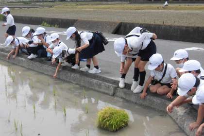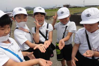 6月2日(水)学校の外に、生き物探しに出かけました。いつも通り、みんなで歌を歌いながら楽しく見つけに行きました♪普段、何気なく見ている田んぼの中をよく見ると、タニシやカブトエビがたくさんいることを発見し、大盛り上がりでした。他にも、トンボやチョウなども見つけ、自作の生き物ビンゴが揃った子がたくさん出てきました。自分の周りにいるたくさんの生き物に、みんなで気付くことができ、楽しくて有意義なひとときでした。