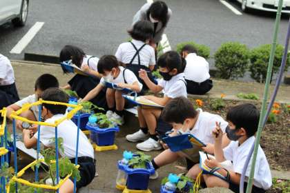 6月4日(金)アサガオの観察をしました。大きくなった葉をじっくり観察して絵に描いたり、気づいたことを書いたりしました。虫眼鏡でよく観察していました。みんな集中して学習ができていてすばらしいです。