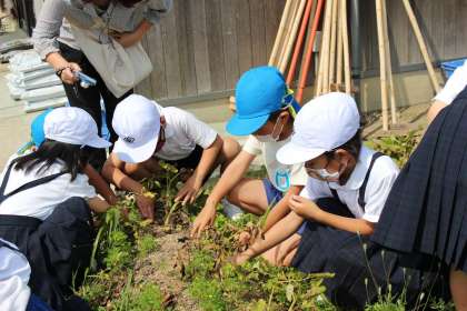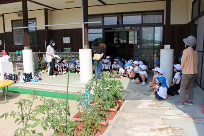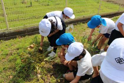 6月8日(火)1年生と比地二幼稚園の年長児青組さんが幼小交流活動を行いました。ペアの顔合わせをした後、1年生が昨年植えた玉ねぎとじゃがいもをいっしょに収穫しました。玉ねぎは地面に顔を出していたのですぐに抜けました。ジャガイモは掘ってみると大きいものが出てくるなど収穫するのにしばらくかかりましたが、みんな大喜びでした。これから何回か交流活動があるので楽しみです。1年生はしっかりお世話をして頼もしくなるとともに、年長さんには小学校に慣れてもらいたいです。