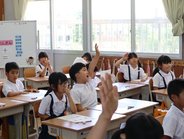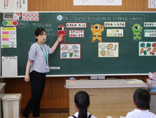 4校時1年生に、3色の食品をバランスよく食べることの大切さを、