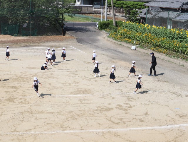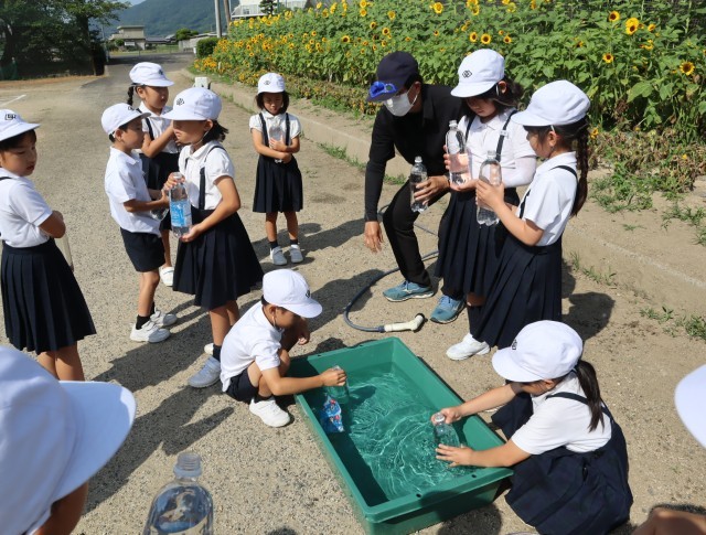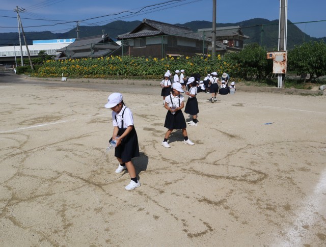 運動場にペットボトルの水で、動物や自然を自由に描きました。
