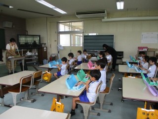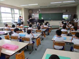 7月10日(木)鍵盤ハーモニカ教室ということで音楽の先生がおいでて、1年生に教えてくださいました。鍵盤ハーモニカで、「さんぽ」やドラえもんの歌を演奏してくださったり、一緒に指の体操をしたりした後、1年生も「チューリップ」を鍵盤ハーモニカで演奏しました。