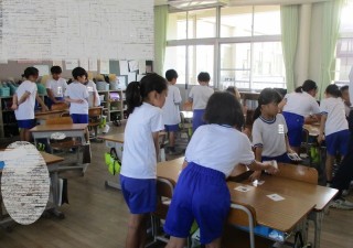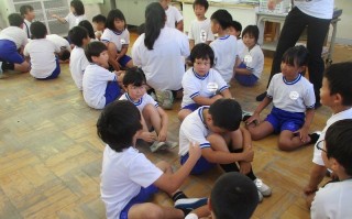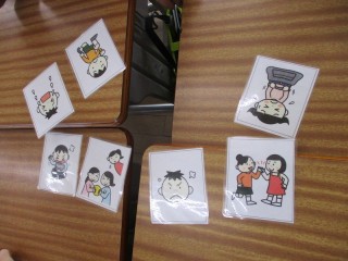 7月のソーシャルスキルトレーニングは下学年と上学年で別の活動をしました。下学年は「後ろにいるのはだあれ?」で、集団での遊びを通して楽しさを感じ関わりを増やそうと、「かごめかごめ」遊びをしました。上学年は、「言葉かけカルタ」で、「どうしたの」など、お題の言葉をかけてあげたい表情絵カードを選び取る「カルタ」遊びをしました。