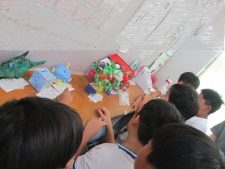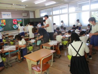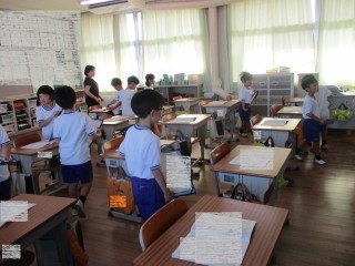 朝の時間に、自主学習ノートの展示会をしました。各学年1つ下の学年の教室に行き、よさやがんばりを見付けて付箋にコメントを書いて貼ったりシールを貼ったりしました。今回は、工作や自由研究などの夏休みの作品も展示会も兼ねていました。