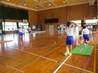 6年生の体育です。クラスごとに分かれて、幅跳びと高跳びを練習しています。