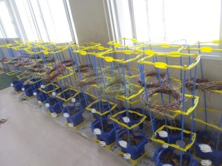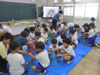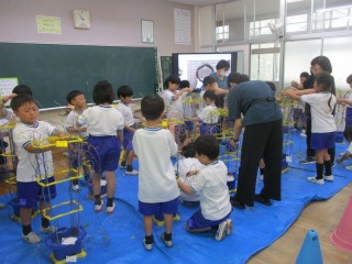 大切の育ててきたアサガオのつるを使ったリースづくりをしました。大変だったのは支柱から外す作業でした。友だちと協力し合って外した後は、またまた協力し合ってコーンに巻き付けて輪の形にしました。