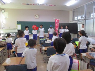 9月の生活目標は「にこにこ あいさつ はきはき へんじ」です。担当の児童会役員の6名が話し合い、朝の時間にあいさつを呼びかけることになりました。児童玄関であいさつをした後、今日は、1、2、3年生の教室であいさつをかわしあいました。あいさつで元気に1日を始めてもらいたいと、楽しい仮装もしています。