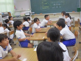 9月22日(月)3年生が学級目標を振り返っていました。9月が終わると今年度も半分が終わることになります。そこで、学級目標「広げよう やさしさの『わ』~輪・笑・和~」について振り返っているようです。まず、グループごとに話し合っていました。