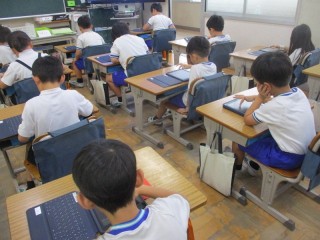 タブレットを使ってドリル学習をしました。ICTの先生も教えてくれています。
