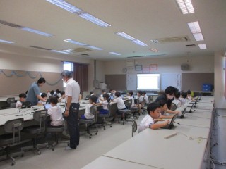 タブレット画面に指で字を書いて、「上たかせ小がっこう」と入力しています。小さい字が難しかったようです。また、「う」は書き方によって「ラ」に変換されてしまうので、それも難しかったようです。