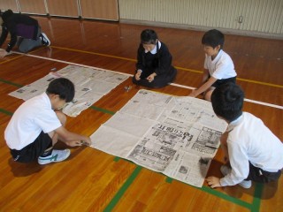 1㎡ってどれくらい?(4年1組) 公開日 2025/10/28 更新日 2025/10/28 4年生 算数で面積を学習している4年生。今日1組さんは体育館で、新聞紙で1㎡の大きさを作って、実際の面積を体感していました。