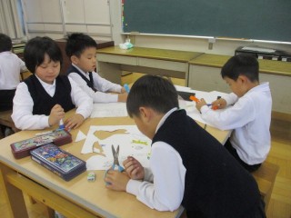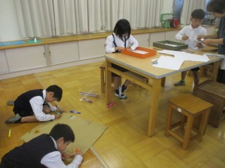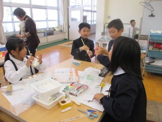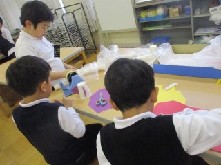 2年生のおもちゃづくりが進んでいます。とことこ車や空気ロケット、はたはたカー、めいろなどグループごとに作ったり遊んでみたりと、1年生を招待して楽しんでもらおうとがんばっています。
