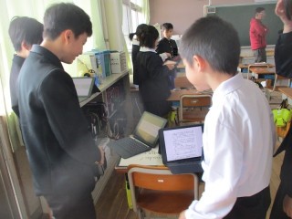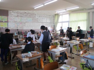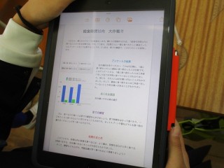 国語のプレゼンテーションをしよう」という学習で、学校生活をよりよくするにはどうしたらいいのかについて、各グループでアンケート結果などの資料を使って提案するための練習をしています。