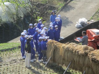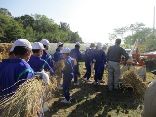 田植え、稲刈りと実施してきた5年生の稲作体験もいよいよ最後の脱穀です。はでにかかっている稲を一束ずつ機械に通していきました。みんなで協力し合って、何回も何回も作業を繰り返し、はで2つ分の脱穀を終えることができました。終わった後の稲わらの量に驚いた子もいたと思います。お世話してくださった方、今日もありがとうございました。