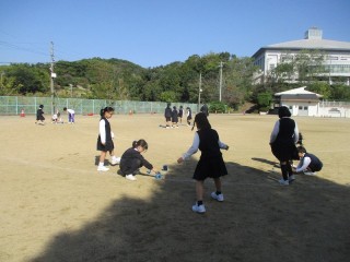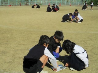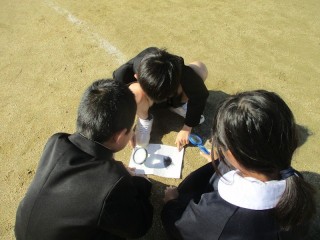 理科の時間、小運動場で実験です。まず、大きい虫眼鏡と小さい虫眼鏡とで、黒く塗った紙の焦げ方を比べました。次は、鏡を使って日光リレーをしました。