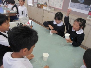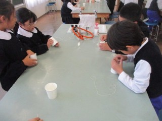 今日の理科は糸電話を作って、音のつたわりを体験しました。3年生の理科、楽しそうです。