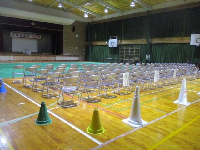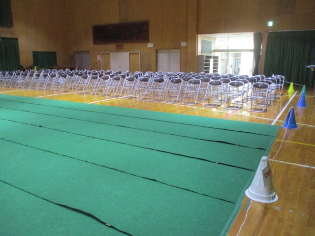 16日(日)の上高瀬地区文化祭の会場準備が児童の下校後行われました。昨年度同様、児童の入退場用の通路をコーンで示していますので、コーンの内側でご参観くださいますようお願いいたします。なお、今年度は、座布団の劣化もあり、座布団を敷かず、じゅうたんのみとなっております。座るための座布団やクッションなどが必要な方はお持ちください。当日、会場の体育館は9時開場です。早くおいでた方は、控室としてランチルームをご利用いただけます。