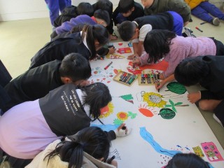 6時間目、工事中の歩道橋に飾る看板の絵が進んでいました。3年生のテーマは「春夏秋冬」です。それぞれの季節に合った絵がどんどん描かれています。