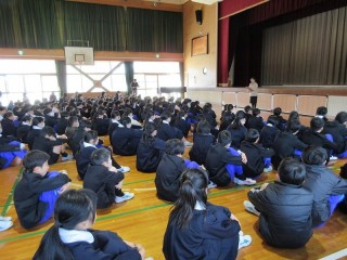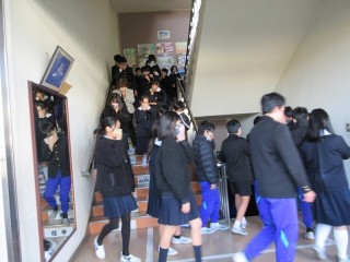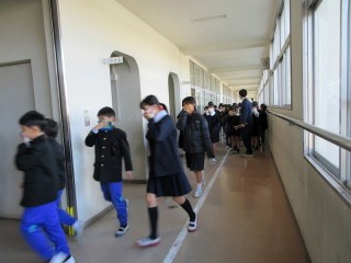 火災対応の避難訓練を実施しました。火災報知機のベルが鳴り、避難の放送があると、静かに並んで避難しました。気温と風の強さのため、避難場所は体育館となりましたが、上高瀬幼稚園の子どもたちも、小学生も、「お は し も」を守って訓練をすることができました。