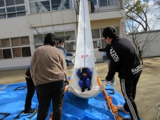 2年生がシューター訓練を行いました。図工・生活科室のベランダから中庭にシューターを使って降りてくる訓練です。