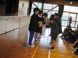 新旧児童会役員引継ぎ会 公開日 2026/02/03 更新日 2026/02/03 学校全体 給食委員会からの目標周知の後、新旧児童会役員引継ぎ会を行いました。6年生の児童会役員さんが、できるようになったことなどを一人ひとり発表した後、花束贈呈、バッジの引継ぎ、新児童会役員任命をしました。