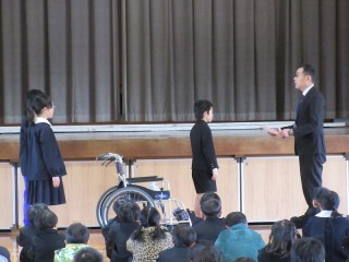 今朝の全校朝会では、まずインターンシップで昨日から20日まで上高瀬小学校に来てくれている大学生の紹介がありました。その後、今年度集まったアルミ缶の収益で購入した車いすを社会福祉協議会の方に6年生の児童会役員さんが贈呈しました。アルミ缶回収にご協力くださり、ありがとうございました。