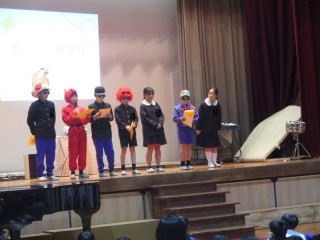 スーパーきらりキッズタイムがありました。今回は、児童会、放送委員会、保健委員会の子たちが準備、進行をしてくれました。写真は司会の子たちです。他にも、誘導係、スライド作成係、プログラム係などに分かれて、今日のためにがんばってくれました。ありがとうございました。また、なわとびや演奏、おわらいなどの出場者のみなさんもありがとうございました。スーパーきらりキッズタイムの後は、6年生を送る会で予定していた全校ゲーム「ジェスチャーリレーゲーム」をしました。「おばけ」というお題でジャスチャーをしていっての答えが「コマネチ」になっていたりと、おもしろく楽しいひとときでした。5年生のみなさん、ありがとうございました。