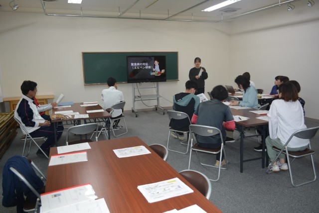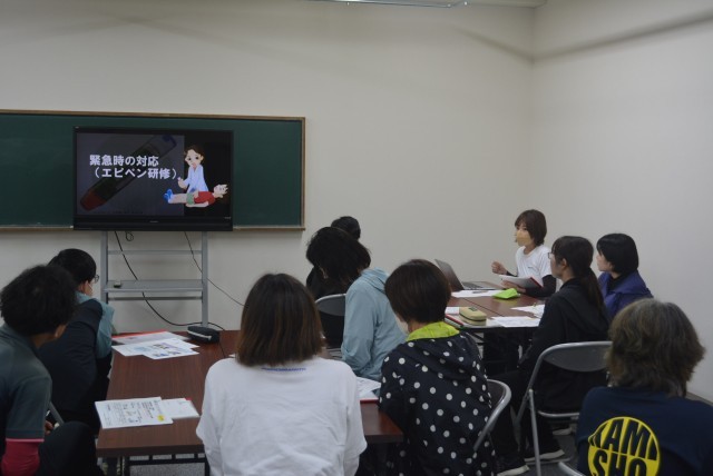 子どもの命を守るため、緊急時を想定した実演を交えながら、全職員で取り組みました。