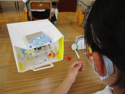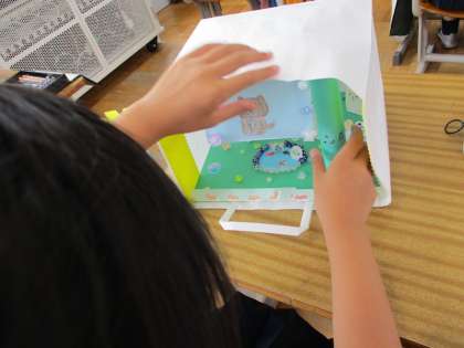袋の中に、こんなところだったらいいなと思う、自分だけの世界を自由に想像して、作っていました。のぞき込むのが楽しくなりました。