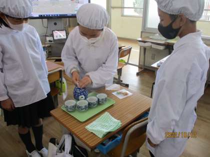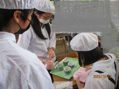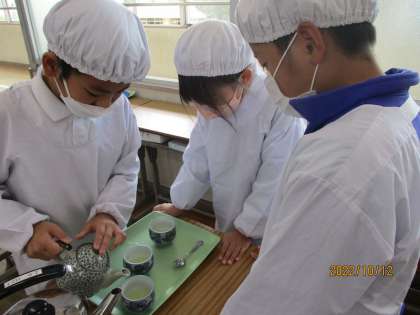10月12日(水)、家庭科で緑茶を入れました。ガスの元栓の開け方や火のつけ方など、家庭科室の使い方も練習しながらの実習でした。茶葉を適量入れたり、湯呑を温めたり、お茶を入れたりをちょっと緊張しながらも、順序良くできていました。