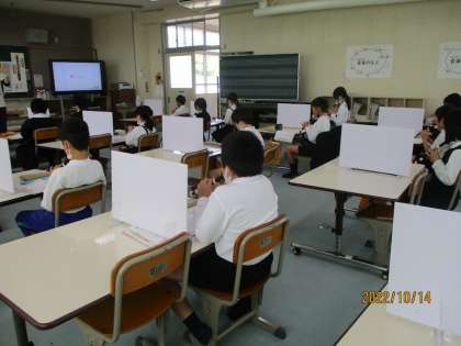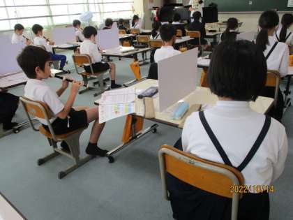 10月14日(金)、音楽の時間、リコーダーの優しい音色が響いてきたので、音楽室におじゃましました。今日は、「もののけ姫」の1、2フレーズを練習していました。しばらくしてみんなで合わせてみると、なつかしい旋律が聞こえてきました。