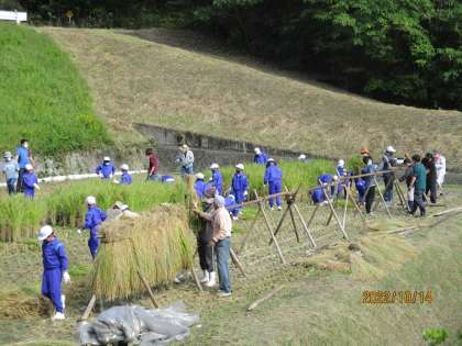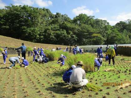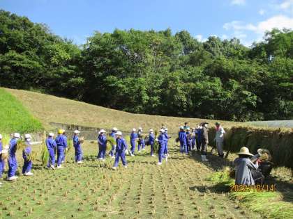10月14日(金)、天候に恵まれ、いよいよ稲刈りです。お世話くださっている方に刈り方や束ね方を教わり、活動開始です。刈り取って、束ねて、立ててくださったはでにかけてと大変な作業でしたが、お世話くださっている方や、上小ふるさとの会の方、PTA役員の方、保護者の方、たくさんの方と一緒に、5年生はやりおえることができました。ご協力、ありがとうございました。